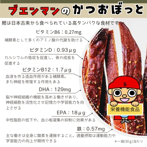 「ブエンマンのかつおぼっと」にはビタミンB12、鰹に豊富に含まれるDHA、EPAも摂取することができる、栄養機能食品です。