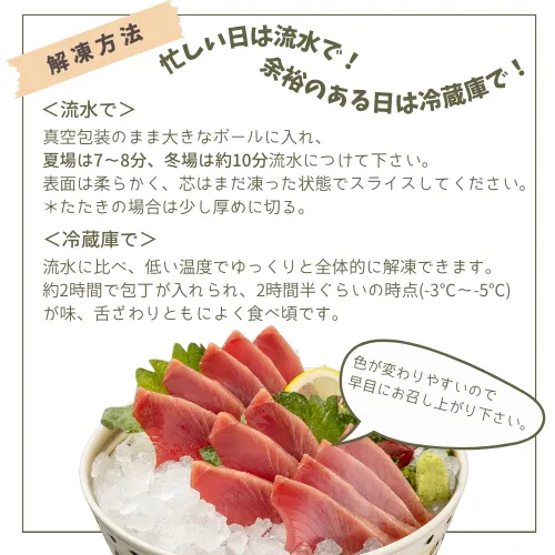 - ③ 水でよくすすぎ固く絞ったふきんで、かつおを隙間なく包み、冷蔵庫で60~90分間チルド解凍し、スライスする。