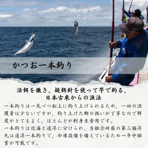 一本釣りは一尾づつ船上に釣り上げられるため、一回の漁獲量は少ないですが釣り上げた鰹の扱いが丁寧なので鮮度がとてもいいです。そのためほとんどが刺身生食用です。