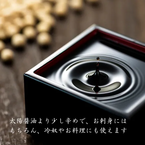 太陽しょうゆより少し辛めで、お料理はもちろん、冷奴やお刺し身にも使えます。